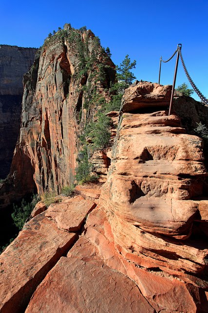 On my second day in Zion I hiked up to Angel’s Landing, a sandstone rock formation that juts out into the canyon and offers amazing views in all directions. The hike is relatively short – about 5 miles roundtrip – but there’s a lot of elevation gain and the last half-mile takes you out on a narrow path with steep drops on both sides. There are chains to hold as you pass through the more dangerous spots, but it would be a tough haul for someone who isn’t comfortable with heights. Photos don’t do justice to Angel’s Landing, but the shot below gives a sense of the final stretch of the trail.