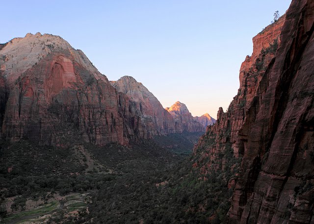 The Angel’s Landing hike is so popular that it gets clogged with swarms of people during the summer. Big crowds ruin a hike for me, so I decided to get there while the masses were still asleep. Years ago Zion closed most of the valley to personal cars in an attempt to cut down on traffic, forcing everyone to take a shuttle bus to the key points. I took the first bus of the day, the 5:45am “Express Bus” – not to be confused with the 6:30am “First Bus” (which is really the second bus). The terminology might not be intuitive, but the Express Bus did the job – only four other people got off at the stop for the Angel’s Landing trailhead, and they hiked at a different pace so I basically had the whole place to myself. For almost a half hour I was the only person at the final viewpoint, early enough that I saw the first light of the day hitting the valley. On my way back down I passed over 200 people heading up and felt really good about my decision to resist the snooze button on my alarm and get there early.