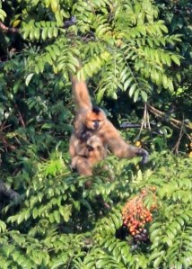 Before lunch the guides spotted another group of gibbons, still far away but a little easier to see. Earlier Jeff had mentioned that in the treehouse he kept a powerful Canon lens (a 300mm f/2.8 L IS USM with a 2x extender) and that I was free to use it. So I switched to that lens, which helped me get a few photos that at least show the wild gibbons, although the images are very low-resolution thanks to a heavy crop. The guides explained the counter-intuitive coloring – Black Gibbon males have black hair but the females are orange-brown.