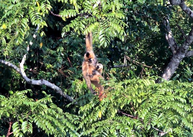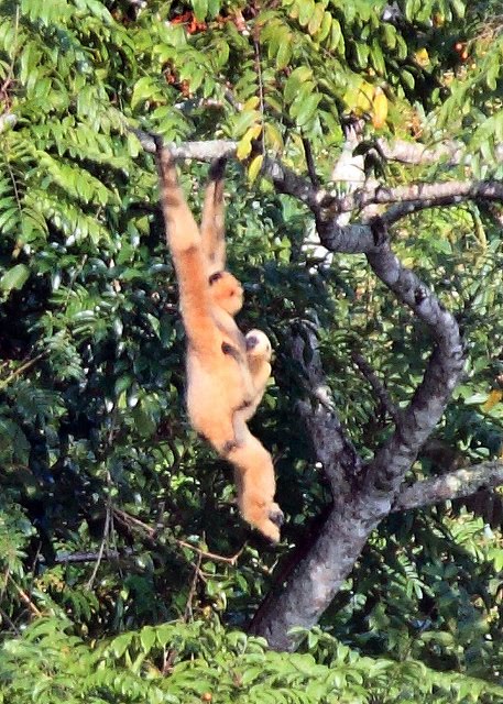 Before lunch the guides spotted another group of gibbons, still far away but a little easier to see. Earlier Jeff had mentioned that in the treehouse he kept a powerful Canon lens (a 300mm f/2.8 L IS USM with a 2x extender) and that I was free to use it. So I switched to that lens, which helped me get a few photos that at least show the wild gibbons, although the images are very low-resolution thanks to a heavy crop. The guides explained the counter-intuitive coloring – Black Gibbon males have black hair but the females are orange-brown.