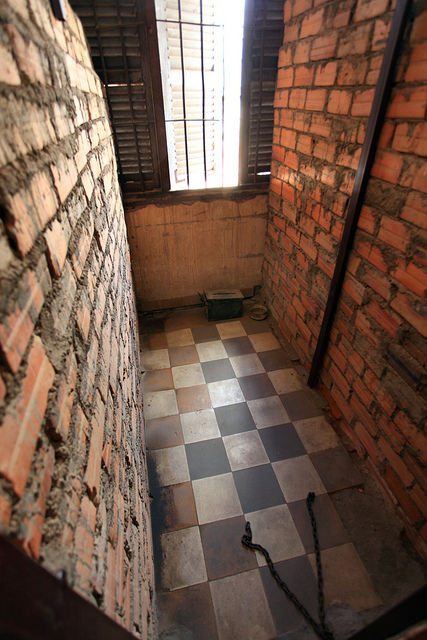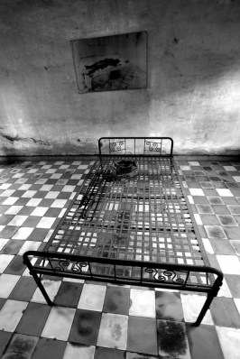 Like most visitors, Marie and I started our tour of the Tuol Sleng Museum by walking through the converted classrooms where prisoners were chained to metal bedframes and tortured. Then we went next door to a building filled with row after row of tiny detention cells. Prisoners lay on the floor, in the dark, listening, no doubt, to every terrible sound coming from the torture chambers.