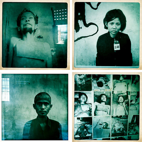 On Sunday, Marie’s first and only full day in Phnom Penh, we took a tuk-tuk to the city’s most popular tourist destinations: the Tuol Sleng (S-21) Museum and the Killing Fields. Both sites were used by Pol Pot’s Khmer Rouge regime when it ruled Cambodia from 1975-1979. The Khmer Rouge made a radical attempt to transform Cambodia into an agrarian-based communist society dominated by peasants, and in the process they committed genocide. According to most estimates the Khmer Rouge were responsible for the deaths of almost two million people, representing about one-fourth of Cambodia’s entire population at the time. They abolished the use of currency, outlawed religion, confiscated all private property, and murdered anyone who seemed the least bit intellectual (which included anyone wearing glasses).