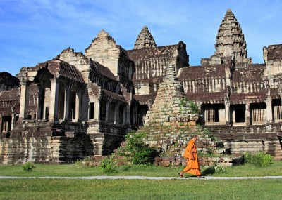 The sunrise on our second morning at Angkor Wat, beautiful as it was, didn’t compare to the day before, and on the temple grounds afterwards Marie and I once again came up empty in our search for monks and monkeys.