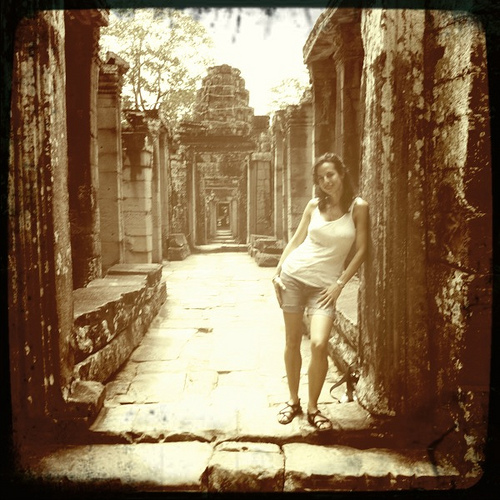 And right after that we spotted a big group of monkeys running along Angkor Wat’s outer wall. Once again I shamelessly pressured Marie into approaching potentially rabid animals for the sake of a photo opportunity. “I have this package of cheese and crackers,” Marie said. “Should I give it to them?” Before I could answer all the monkeys suddenly began converging on Marie, who yelled something that sounded vaguely like “Eeeep!” as she threw the cheese and crackers into the air. I was facing the other way and saw only the little red cheese-spreading stick fly past.