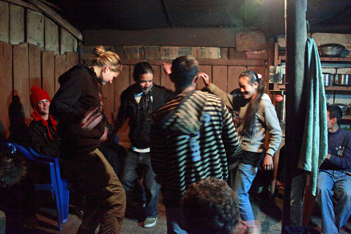 After dinner that night some of the locals gathered in the small kitchen next to the guest house and started singing and dancing. We ordered beers and joined the party. Every time we started a new beer, the locals encouraged us to toast by yelling “Chakmati!”, after which they always burst out laughing. We asked Bharat to translate “Chakmati” for us. “I cannot,” said Bharat, looking embarrassed. We pressed him. “It is like ‘ass,’” he finally told us, “but also something else.” Good enough!
