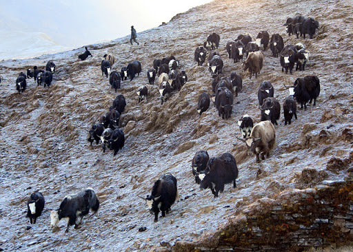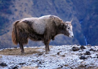 Out of the tent before dawn, wearing almost all the clothes I had with me, I watched the mountains surrounding Khopra Ridge gradually appear in the morning light. Yaks slept on the hillside, their coats covered with a layer of frost.