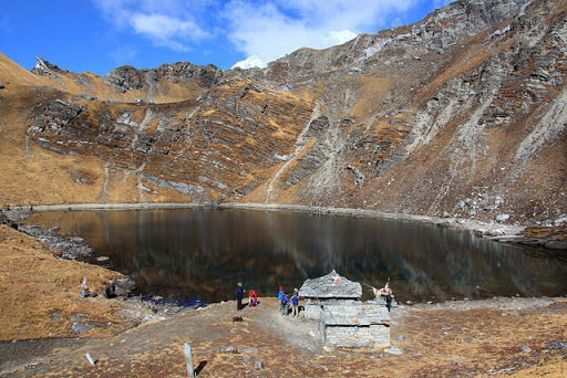 Finally we arrived. The lake itself wasn’t especially impressive, but we didn’t care – the fact that we reached it mattered more. Partly for fun and partly to keep warm, Bharat, Shasu (our assistant guide), and the porters started dancing, eventually drawing in Shawn, Penny, and Tato.
