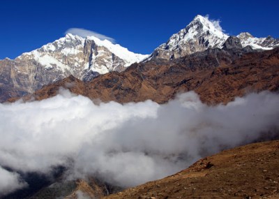 The clouds moved in at mid-day, a pattern we now recognized as regular, but when Khopra Ridge came into view we could still see enough to recognize it as special. The ridge occupied a thin area of flat land bordered by steep drop-offs on three sides. To the northwest rose Dhaulagiri and to the northeast, very close to us, towered the western end of the Annapurna range, including Annapurna South, Varaha Shikhar, and Nilgiri South. The views, even when partially blocked by the clouds, were truly incredible.