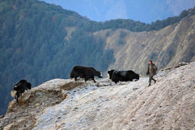 Two kinds of gray stone buildings occupied the ridge itself – a trekking lodge on the south side and a yak farm on the north side, divided only by a low rock wall. All the yaks were grazing out of sight when we arrived, but that evening we heard the bells around their necks as the herder brought them back to the pen by their barn.