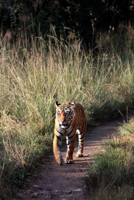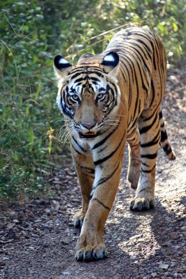 I remember holding on tight as we splashed through a creek and sped around a bend, when suddenly I realized that through the jeep’s windshield I was looking at a tiger. A very close tiger! The jeep skidded to a stop and we all leaped to our feet. The tiger trotted towards us, forcing our driver to put the jeep in reverse to maintain some distance. Even so, the tiger – a four-year old female, we found out later – approached within fifteen feet of our jeep several times and could have closed the distance with ease. For ten minutes she followed us, forcing our driver into an impressive display of driving in reverse.