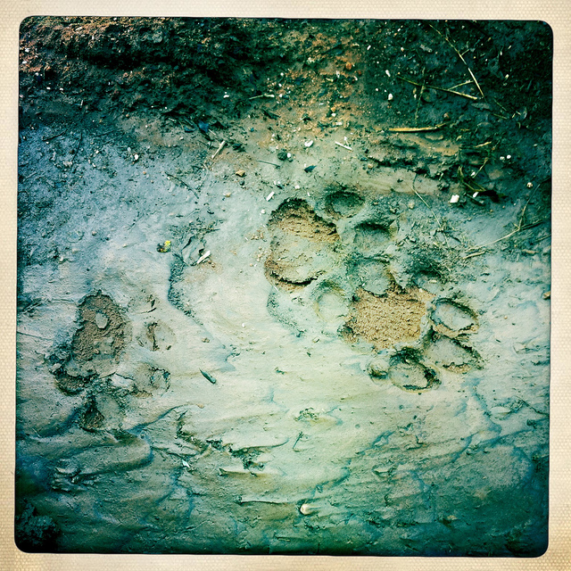 At one point, as we were headed up to higher ground, our guide told the driver to stop. Even in the fast-moving gypsy he’d somehow managed to spot a few faint tiger tracks in mud at the side of the road. We stopped to listen, and our guide heard monkey alarm cries in the distance. “These tracks are fresh,” the guide said. “And now I think the tiger is about 500 meters in that direction.” He pointed towards the sound of the monkeys, back where we’d been earlier.