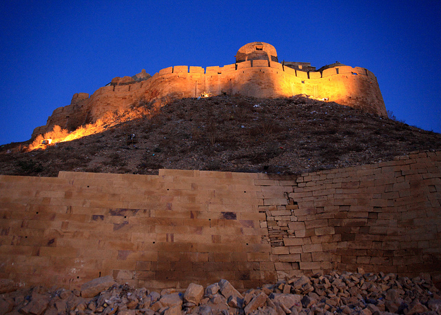 In the morning we returned to Jaisalmer, checked back into the same hotel, and explored more of the Golden Fort. At sunset we returned to the cannon emplacement to watch the last light fade over the city. The weather continued to be perfect and for dinner we took in sweeping views from a rooftop Tibetan restaurant, eating momos as the city turned dark and the stars appeared.