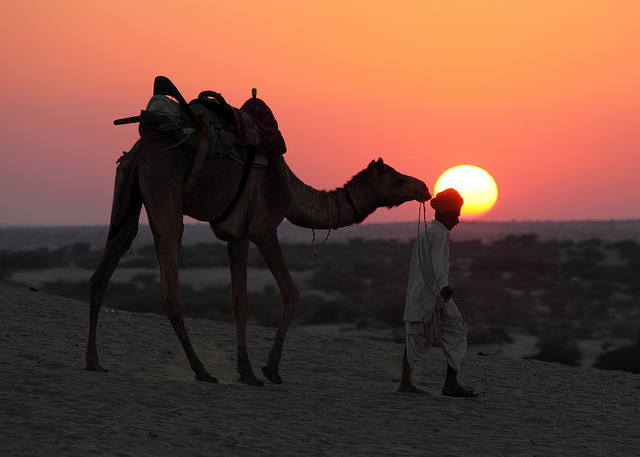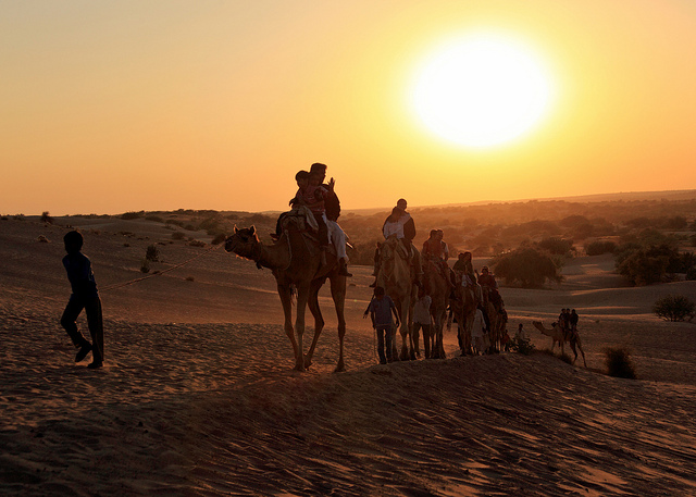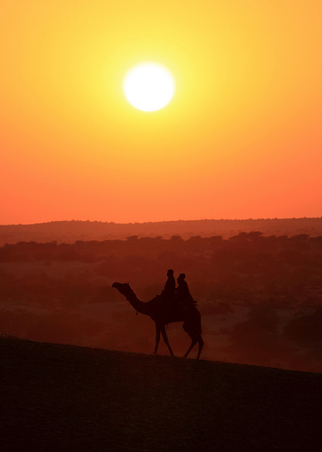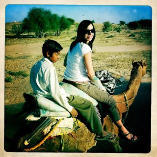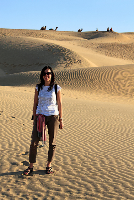 The next day we left for a camel safari to the Khuri Sand Dunes. We shared a jeep with two women, one Swiss and the other French, both in their early 30s. The French woman, Celene, told Marie that she’d fallen in love with a rickshaw driver she met 10 days ago. The driver, a Muslim, said that if they decided to get married Celene would have to convert. It sounded like Celene was open to the idea.