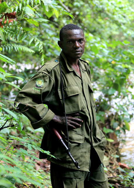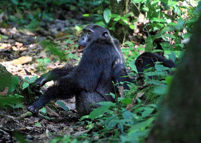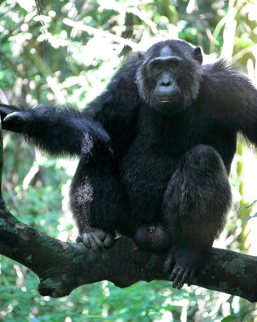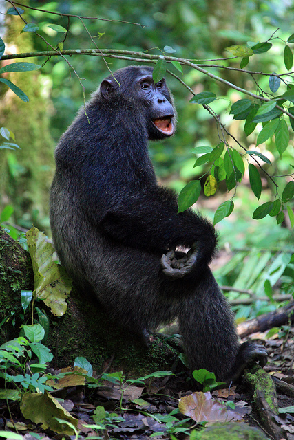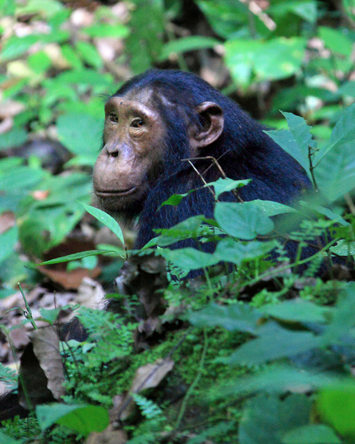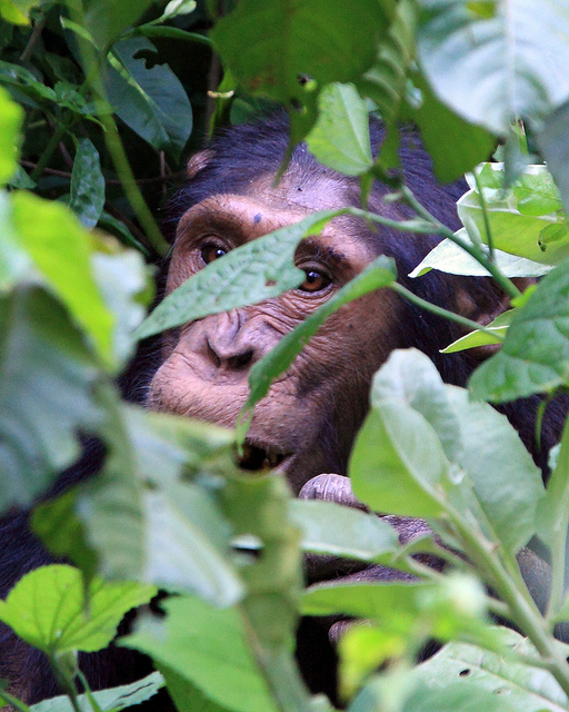 He was spot on. Within five minutes Bernard pointed to a lone chimp eating leaves in the trees below us, its face mostly blocked by the heavy vegetation. The Italians, who had lagged behind all morning, suddenly rushed up and elbowed me aside. Remembering my experience with the mountain gorillas, I tried to relax and not worry about getting the perfect shot. Jake, who had a good angle, generously offered to switch places so I could see better.