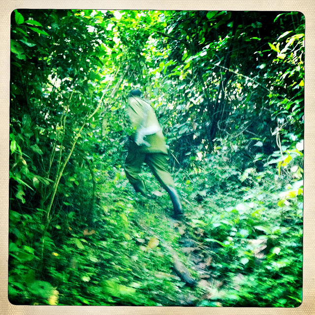 The trail to the river at the bottom of the gorge was somewhat steep, but after the extremes of Bwindi it felt almost leisurely. Bernard took the lead, with Jake and me following him closely. The Italians fell behind right away and kept yelling at Bernard to wait. Bernard was irritated with them to begin with, and I think he enjoyed pushing them a little bit.