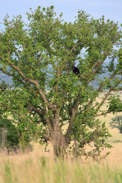 As I was taking photos of the gorge, Andrew yelled and pointed to a distant tree, where a small dark shape moved in the upper branches. A chimp! And we hadn’t even started our tracking hike yet! The chimp was too far away to get good photos, but it was exciting to see him.