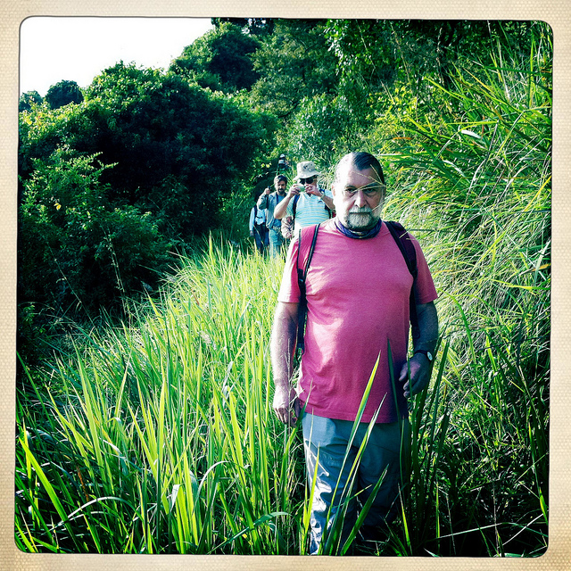 On the other side of the river Bernard heard the chimps. At one point he plunged down an almost-vertical slope by himself to investigate some branches he’d seen shaking. When he returned to the trail he told us to reverse direction. He suspected that some of the chimps had slipped around us and were heading the other way.