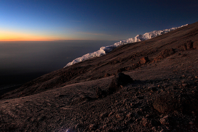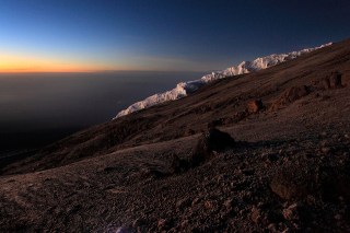 We left Kibo hut and began our climb.  A bright gibbous moon rose above Gilman’s Point like a lighthouse, dramatically backlighting the ominous rock wall in front of us.  Tiny white dots from the headlamps of the hikers who left before us revealed the general shape of the trail, a series of switchbacks winding up the precipitous slope.
