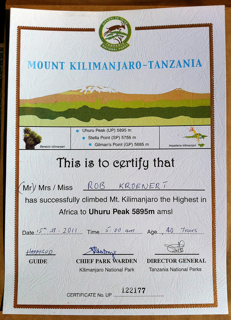 Happy God, Rama and I started early and practically jogged the rest of the way, pausing only to check out a chameleon on the trail.  We reached Marangu in less than two hours.  Back at the entrance gate I signed out and received an official certificate from Kilimanjaro National Park (suitable for framing, of course).