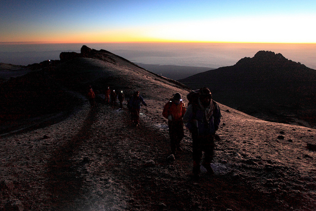 Most trekkers on the Marangu route arrive at Kibo, the final hut, around noon on Day Three.  At Kibo they try to sleep for a few hours, and then at about midnight they make their summit attempt.  It usually takes six or seven hours to reach Uhuru Peak, so – if all goes well – they arrive at the summit just as the sun is coming up.  Many people even push that itinerary back by a full day so they can spend an extra night acclimatizing at Horombo.