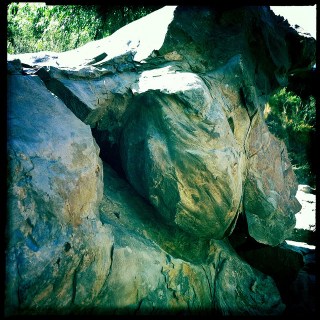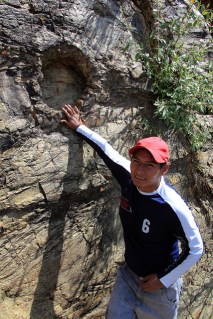 After checking out the upper part of the wall we returned to the creek bed and began walking back to the road.  Eusebio stopped to show me what he thought might be a fossilized dinosaur egg embedded in a large rock.  “It looks just like the eggs they have at Cretaceous Park,” he said.  “But I do not know for sure if it is really an egg.”