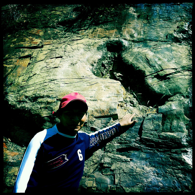 After hiking 40 minutes we turned from the creek and climbed sharply up the side of a hill.  Distinct layers of stratification were visible on the rocks surrounding us, land that was once flat pushed nearly vertical by tectonic collisions of the South American plate with the Nazca plate.  “There is the lower part,” said Eusebio, pointing to a large, gray-brown rock wall dotted with a variety of holes.