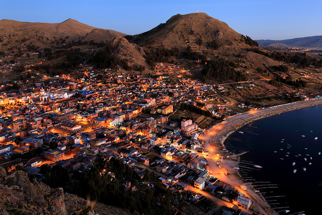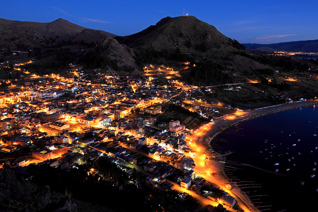 Back in Copacabana I began figuring out my plan for crossing over to Peru.  I’d hear rumors that a group of striking Peruvian miners had blocked the border roads around Lake Titicaca, and one of the local tour agencies confirmed that all the bus routes from Copacabana to Peru were shut down.  The agency said the only way to get to Peru was to take a boat to Puno.  A cruise on the lake sounded better than being stuck indefinitely in Copacabana, so I bought a ticket.  That night I climbed back up Cerro Calvario to watch my last sunset in Bolivia.