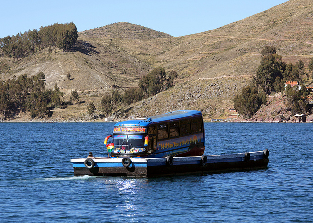 The next morning I made the relatively short trip to Copacabana, a small, touristy city on the southern shore of Lake Titicaca.  Two hours into the ride we reached the edge of the lake, and our driver announced that we all needed to get off the bus so that it could be rolled onto an old barge and ferried across a narrow channel.  Copacabana isn’t on an island, but by cutting across the water we were able to take a much more direct route.  The rest of the passengers and I followed the bus in a creaky wooden motorboat.