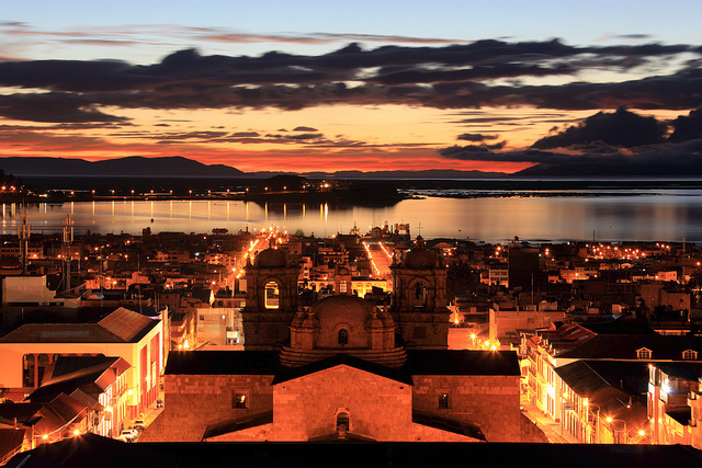 Eventually we all made it on board one of three motorboats and our little fleet set off for Puno. Lake Titicaca is beautiful, but after nine hours I’d had more than enough. It was dark by the time we docked in Puno. I found a hotel room, ate dinner, and crashed. The next morning I opened my curtains and was happily surprised to discover an incredible view of the sun rising over the lake.