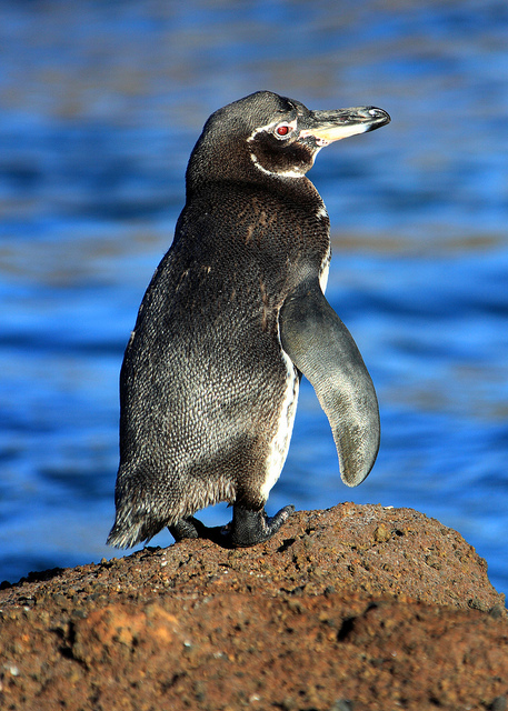 After lunch we motored from North Seymour to Bartolome, joined briefly by several dolphins. As soon as we arrived at the island we headed out to snorkel in the bay next to the iconic Pinnacle Rock. I remembered that I’d once seen penguins on a particular outcrop of stones, and despite the passing of several years I found them in the exact same spot. Water had condensed on the lens of my underwater video camera (a problem that plagued me the entire week), but I managed to get a cloudy shot of one of the penguins as it hopped into the water next to me and swam away.