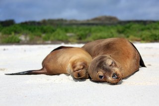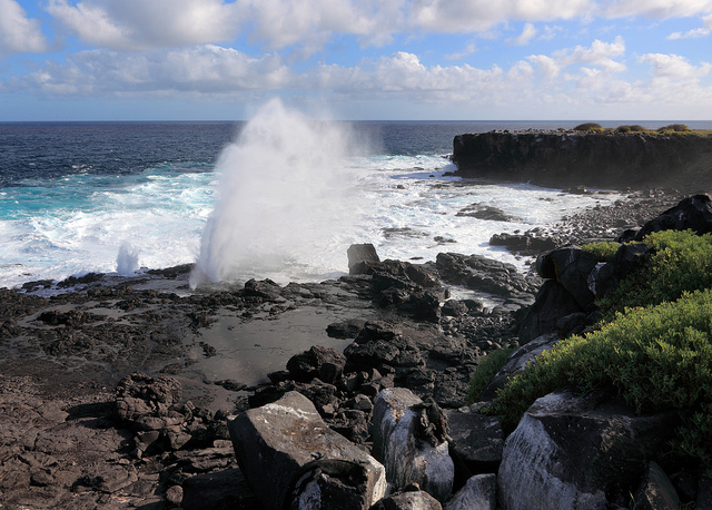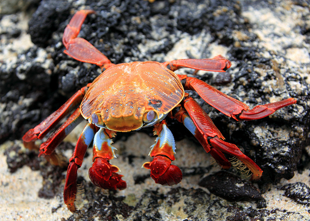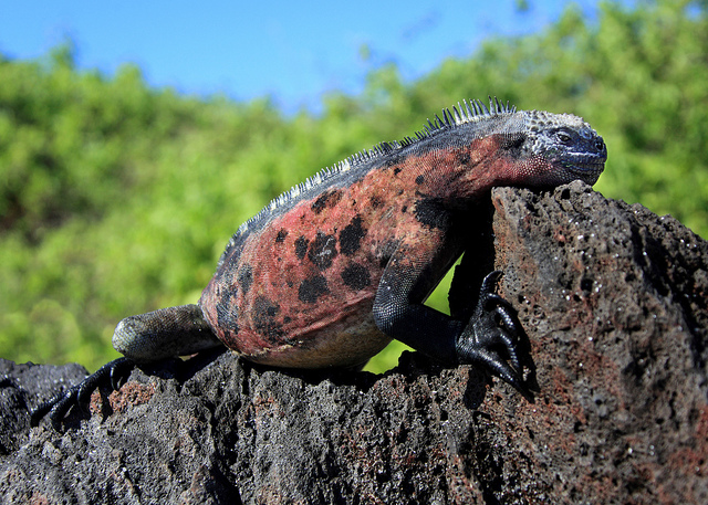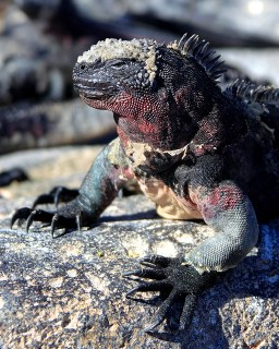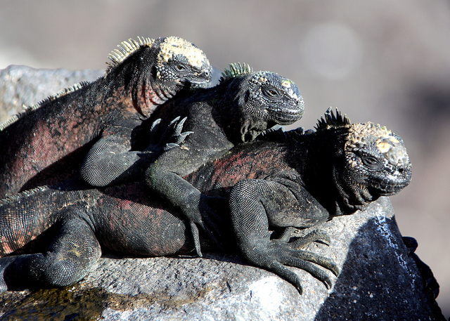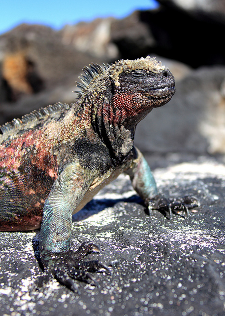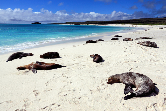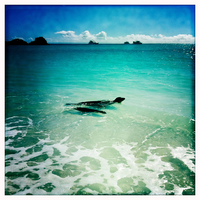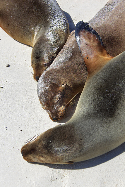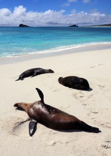 During the night the Estrella del Mar motored from San Cristobal to Española. I woke before dawn and followed my usual routine of climbing to the top of the boat to watch the sun rise. Anchored alongside us were several other boats, including the Guantanamera, my boat when I visited in 2008. After breakfast we headed straight to Española’s Gardner Bay, where over a hundred sea lions lay sleeping on a beautiful stretch of white sand. Just north of the beach, marine iguanas – some with red and green coloring – clung to black volcanic rocks.