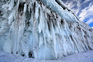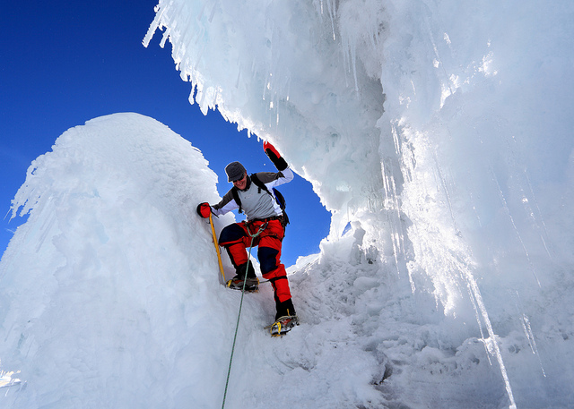 Glimpses of dramatic ice formations appeared in the tunnels of light cast by our headlamps. Massive icicles hung from the edges of frozen cliffs and sinister-looking crevasses dropped into total darkness. The trail sometimes rose so steeply that we had to plant our ice axes for support and literally crawl forward on our hands and knees.
