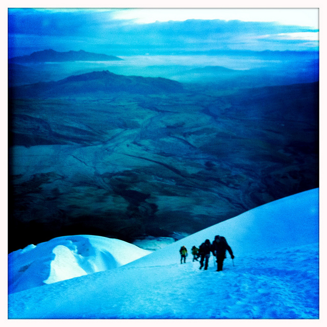 We put on our gear, tried once more to eat, and then stepped out into the cold. The sky had cleared and the lights of Quito glowed orange in the distance. At first we hiked on volcanic scree, but we quickly reached the glacier and had to attach our crampons. Soon afterwards we stopped again to rope ourselves together.