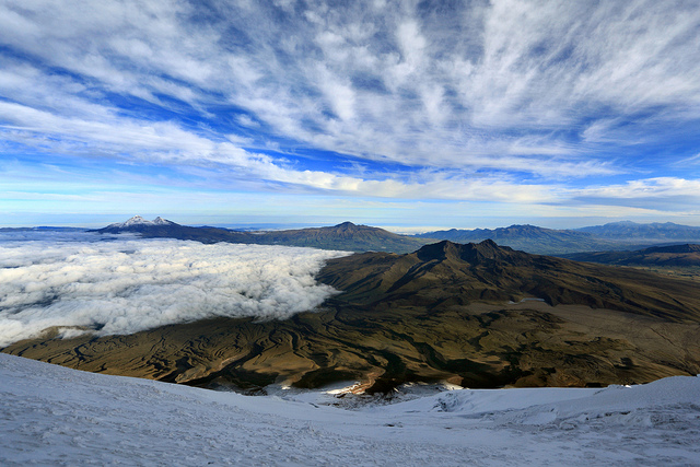 The view was truly incredible. We looked down on Cotopaxi’s crater, steaming in the cold morning air. Other volcanic peaks loomed in the distance, including Chimborazo to the south and Antisana and Cayambe to the north. A sea of low clouds blanketed the countryside to the west. I broke out my big camera and tried to capture a small part of the beauty.