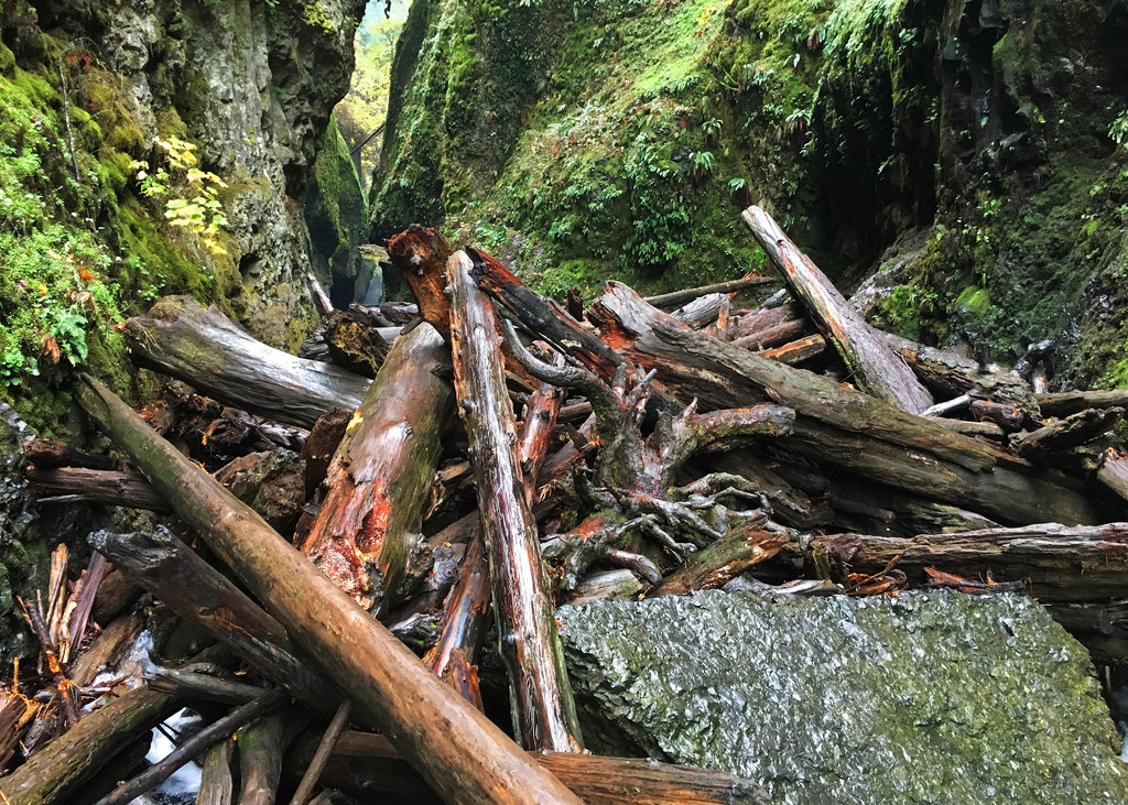 Lower Oneonta Falls is less than a mile away from the entry point to Oneonta Creek, so it’s a short hike. But at the start you have to scramble over a wild tangle of massive logs, and – depending on the water level – there are parts of the creek that can be so deep you need to swim. I’d read many descriptions of the hike online, and some people even go so far as to rent wetsuits.