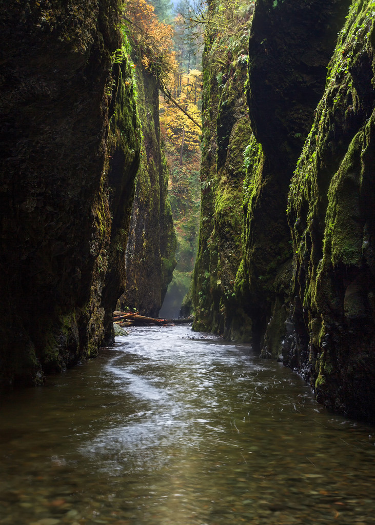 Soon I was back in shallow water walking alone beneath the gorge’s towering moss-covered walls. The beauty of the place quickly pushed away any sense of cold. Tiny streams dripped down from the misty heights on both sides.