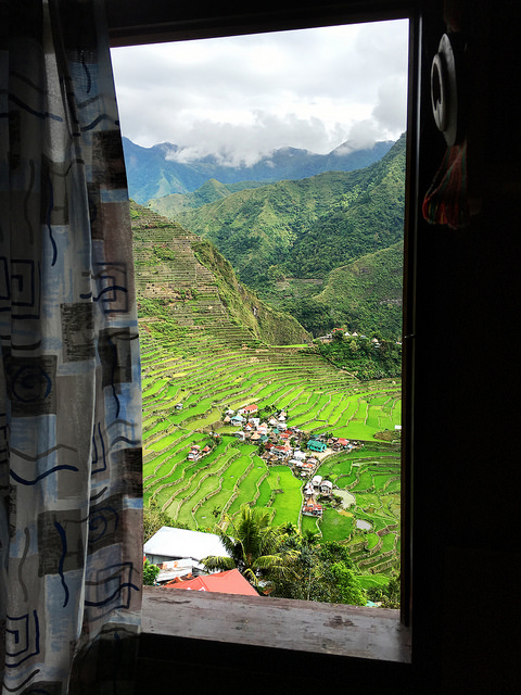 The next morning I stood at my window watching the sun rise and listening to the sounds of the village waking up. The roosters weighed in first and loudest, then flip-flops began slapping on dirt paths, dogs barked, fires crackled to life, kids yelled to each other across long distances, machetes hacked at the encroaching vegetation, and old women – some literally bent 90 degrees at the waist by a lifetime of heavy work – swept floors. The sounds of car engines and honking horns were conspicuous by their absence. Batad didn’t even seem to have a generator, or any draft animals. I hadn’t seen a single horse, cow, or buffalo. All the work was done by hand.