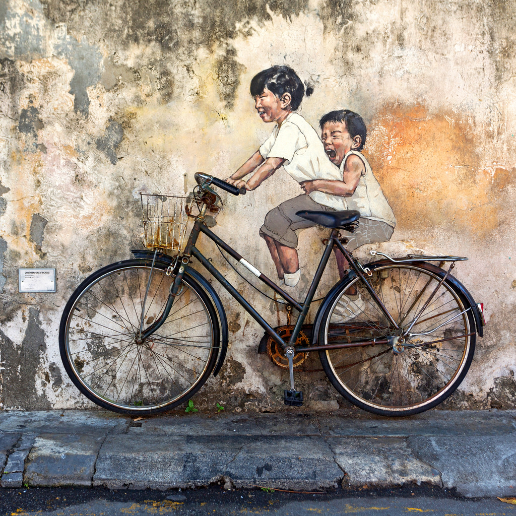 The next morning I went hunting for the work of a Banksy-like Penang street artist named Ernest Zacharevic, who mixes paintings with physical objects.