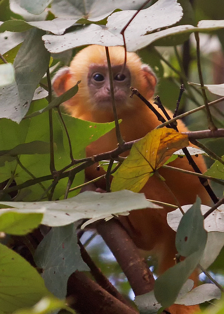 Late in the afternoon I walked over to the boat dock to photograph the sun setting behind a group of dead trees.  The trees had grown on a mud flat that was submerged during high tide, but the tide was out when I arrived and the silvery langurs were crossing the flat.  I noticed that one of the black and gray langurs was carrying some kind of bright orange bundle, which turned out to be an impossibly cute baby langur.
