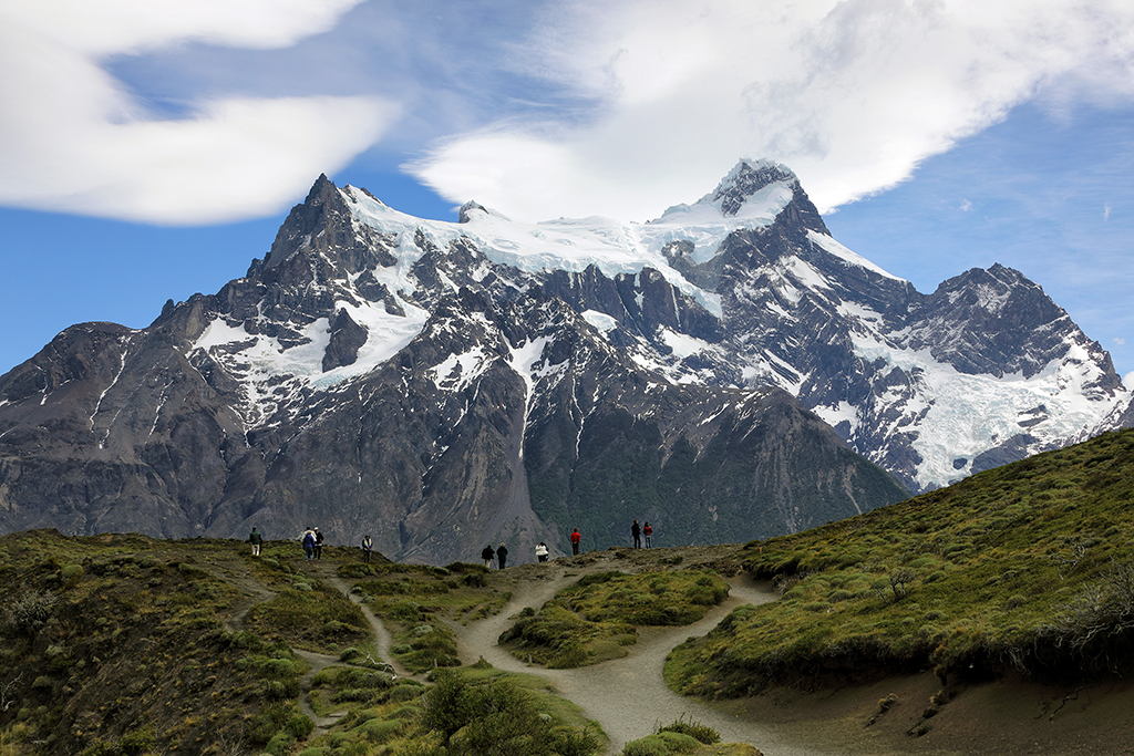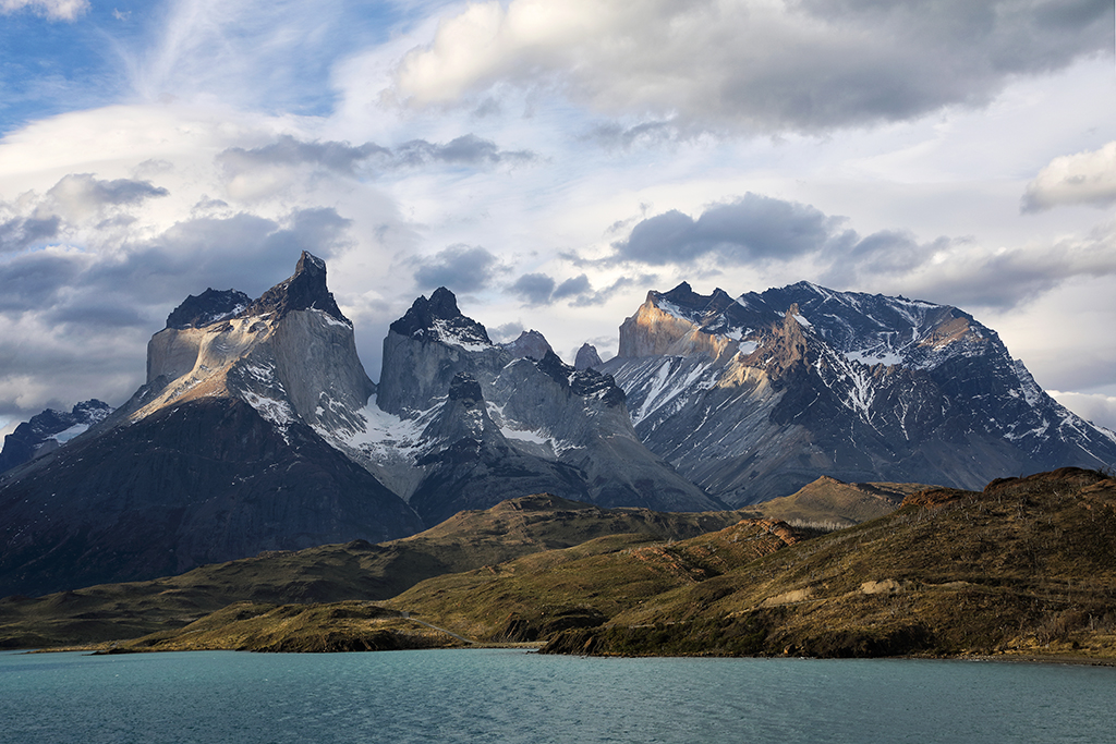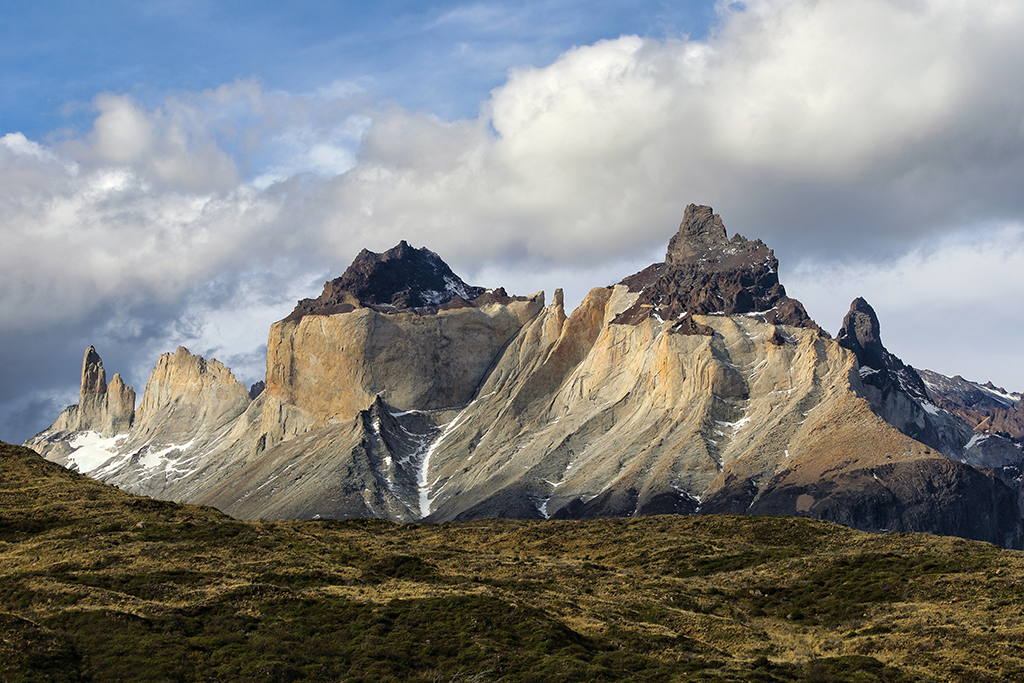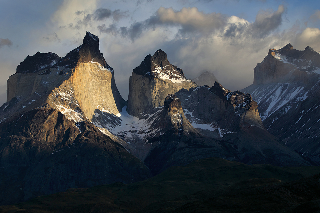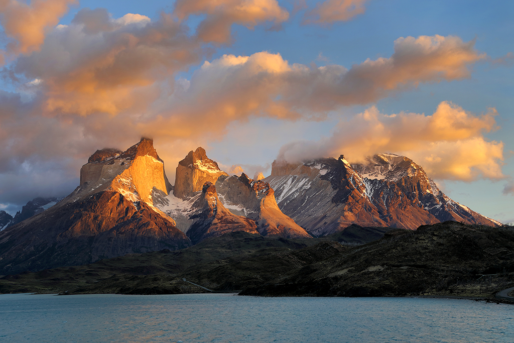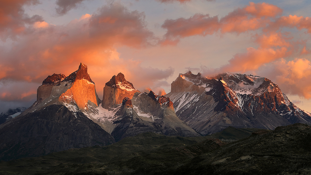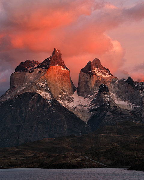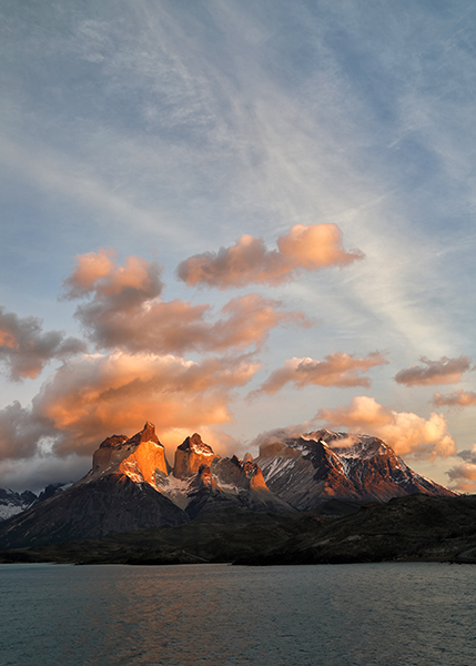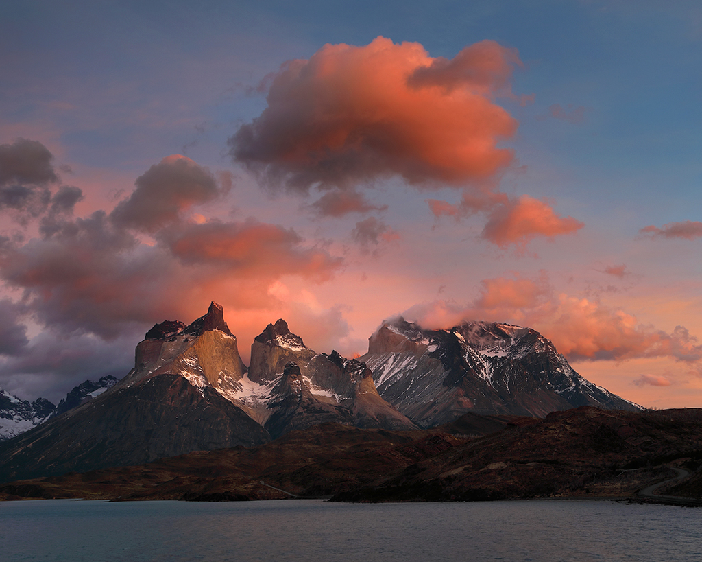 At 5:45am the next morning I crossed my fingers and opened the door of my hotel room. Not much wind, which was a good sign. The eastern horizon looked free of any clouds that might block the sunrise, which was an even better sign. And not only were Los Cuernos fully visible, but a halo of puffy white clouds hovered just above them, perfect for catching early morning color. The conditions were almost too good to be true. I rushed up the hill and couldn’t stop smiling. Slowly the emerging light painted the clouds above Los Cuernos reddish-pink, imperceptibly shifted to soft pastel orange, and finally – after what seemed like forever – the first direct sunbeams of the day lit the peaks of Los Cuernos with a golden yellow glow.