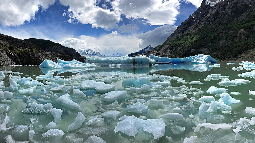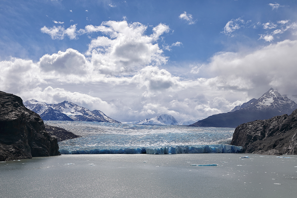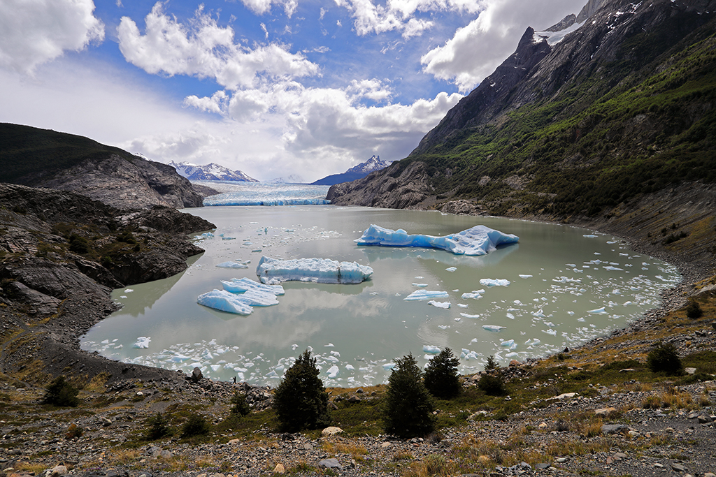 After two nights at Paine Grande I hiked four hours north to Refugio Grey, the upper-left point of the W. From Refugio Grey it only takes about 10 minutes to get to a viewpoint overlooking a massive glacier that calves into Lago Grey. The first sight of it was breathtaking. When I arrived that afternoon hundreds of glittering icebergs – many of them tiny but some as large as buildings – bobbed the small bay beneath the viewpoint.