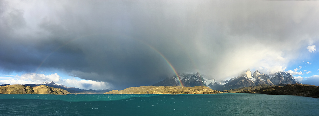 The next morning I bolted out of bed before dawn and practically ran up the hill next to the hotel for a better view of the weather. Clouds blocked the sunrise, unfortunately, but a little bit of early light eventually hit Los Cuernos, and some scattered rain showers even conjured up a rainbow.