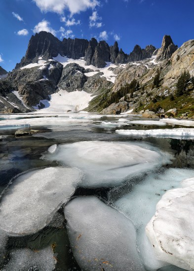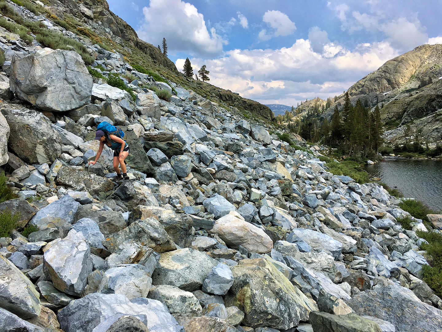 For seven miles we struggled under our heavy packs and marveled at the stark alpine scenery.  After a steep final ascent we finally arrived at Ediza Lake, where we had to hop across a large rockfall to reach the campsites.