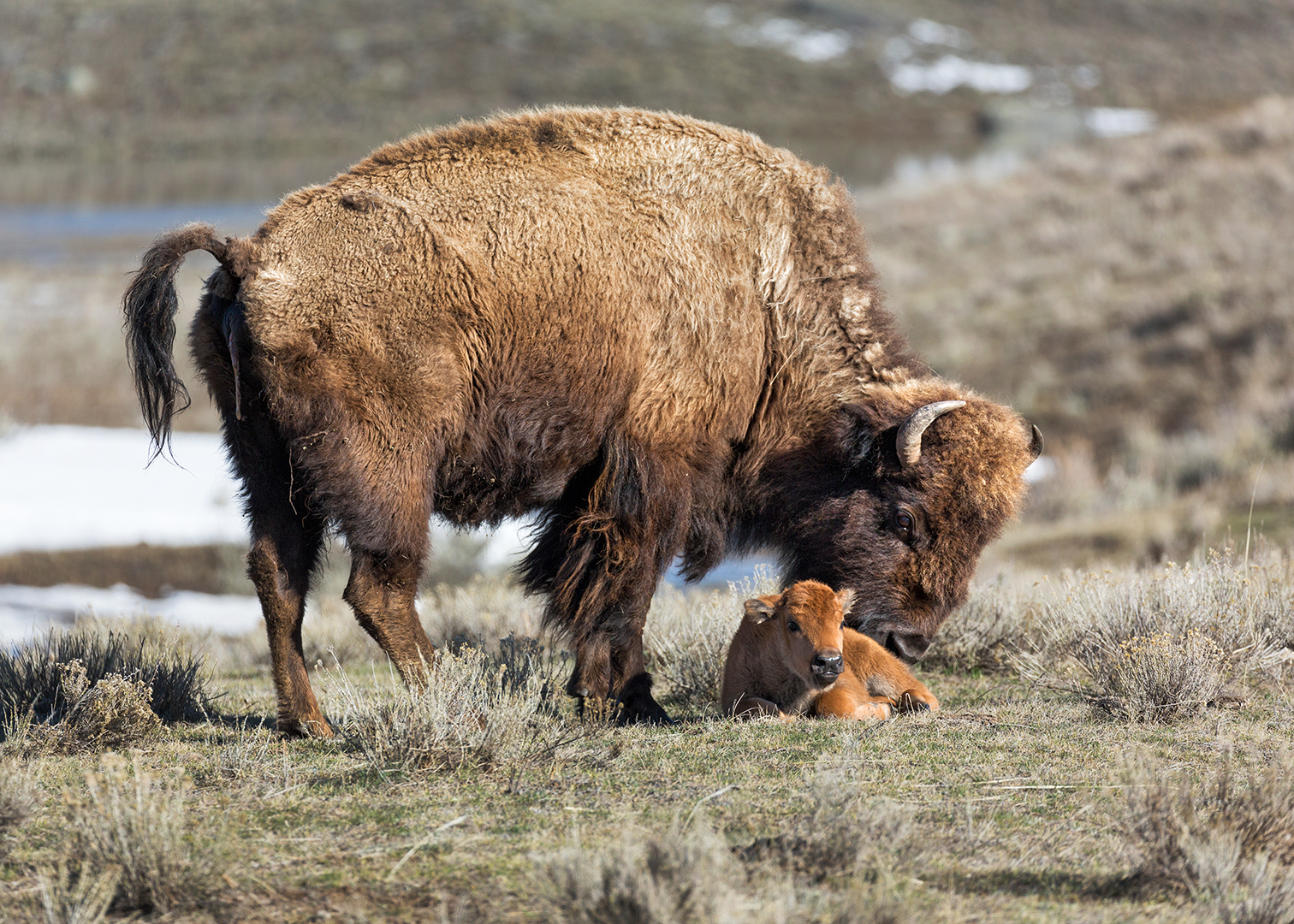 Bison Mom with Very Young Calf