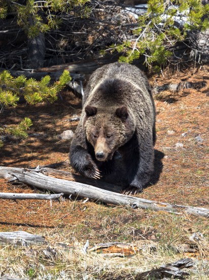 Towards the end of April I decided to hike up the hillside that overlooks Grand Prismatic Spring, but the parking lot for the trailhead was roped off.  Signs said grizzly bears were coming out of hibernation in the area this time of year, and as I turned to walk back to my car I noticed a brown shape moving through the grass on the other side of Firehole River.  A grizzly!  The first I’d seen this season.