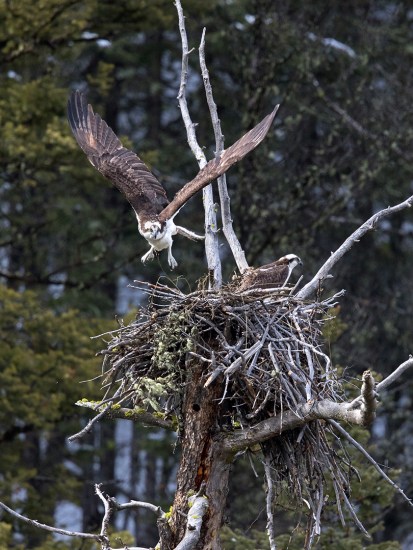 In mid-April at a pullout in Lamar Canyon I met a gruff old curmudgeon named Bob.  He was peering intently through binoculars at the cliffside across the river.  “Osprey nest,” he said, pointing.  Sure enough, a tangle of broken branches woven together at the top of a tall pine tree.  The head of the female osprey peeked out of the top, while the male flew in and out delivering building materials.