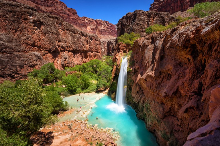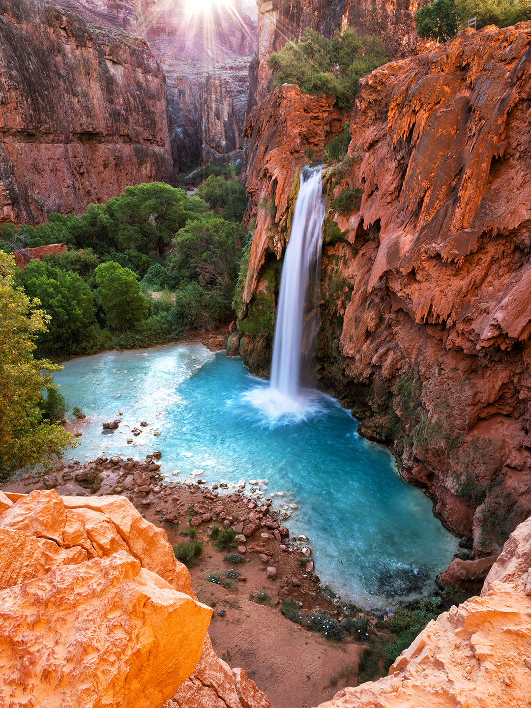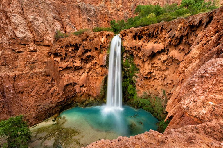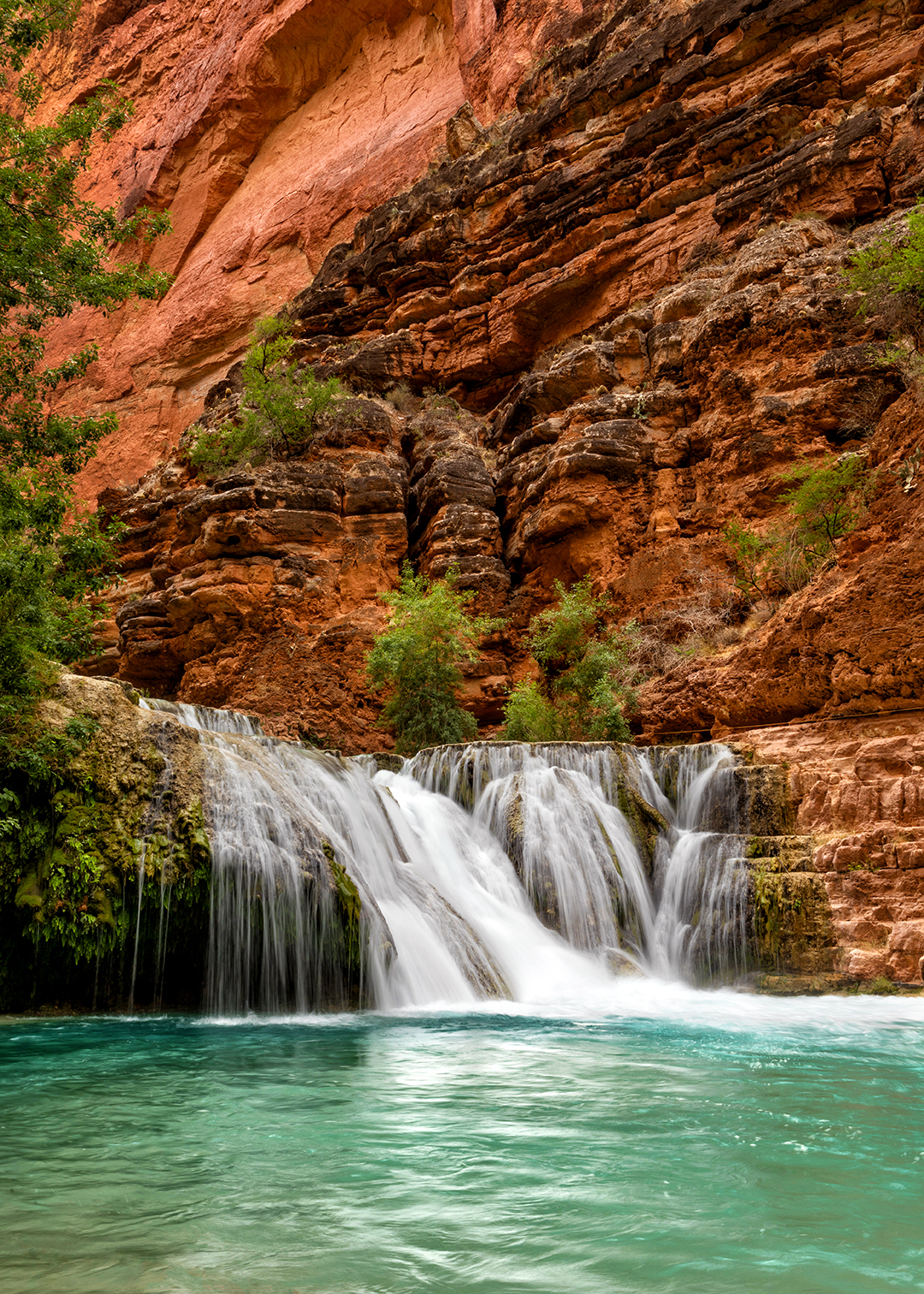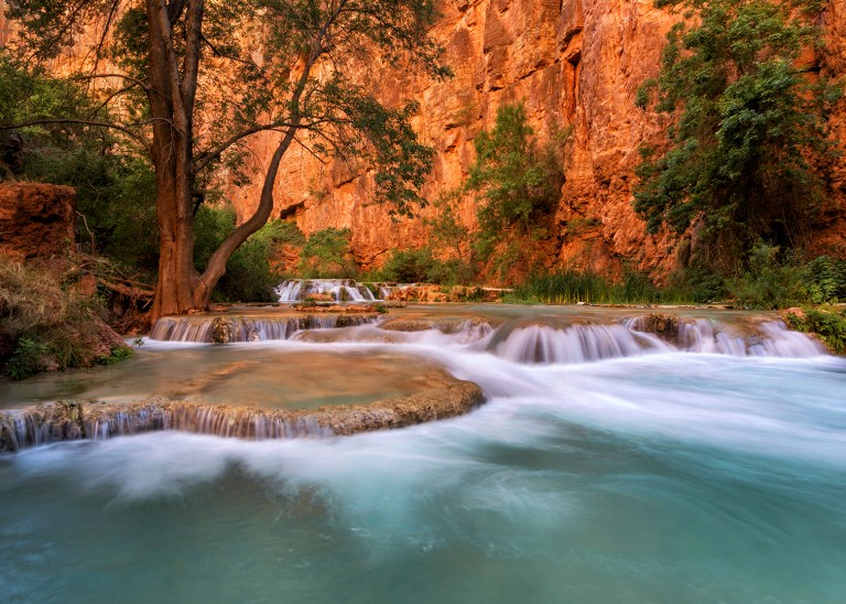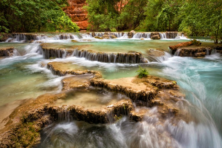 About a mile from the town a bright green line of vegetation suddenly appeared in the otherwise orange sandstone landscape. We’d reached the point where the trail begins to parallel Havasu Creek, Supai’s heart and defining feature. The creek, fed mostly by an underground spring rich in calcium carbonate, has a distinctive blue-green color that inspired the name of the local Native American tribe (Havasupai means “people of the blue-green water”). The creek’s minerals also create an ever-changing array of travertine terrace waterfalls that are so otherworldly you feel like you’ve entered the land of the elves in a Lord of the Rings movie.