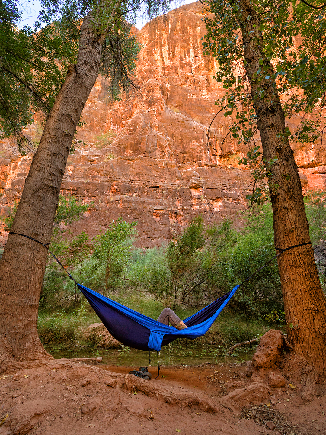 Our plan for the day was to start at Mooney Falls and work our way down to Beaver Falls, which is not too far from the spot where Havasu Creek joins the Colorado River. But the descent to Mooney Falls is extremely steep, with chain handholds and precarious ladders, and Marie opted for some hammock time instead. (After making the descent in 2012, Marie had commented, “I’m glad I’ll never have to do this again.”) Rest sounded pretty good to me too, but that stretch of the creek from Mooney Falls to Beaver Falls is a wonderland and I wanted to see it again. Photos don’t even come close to doing it justice.