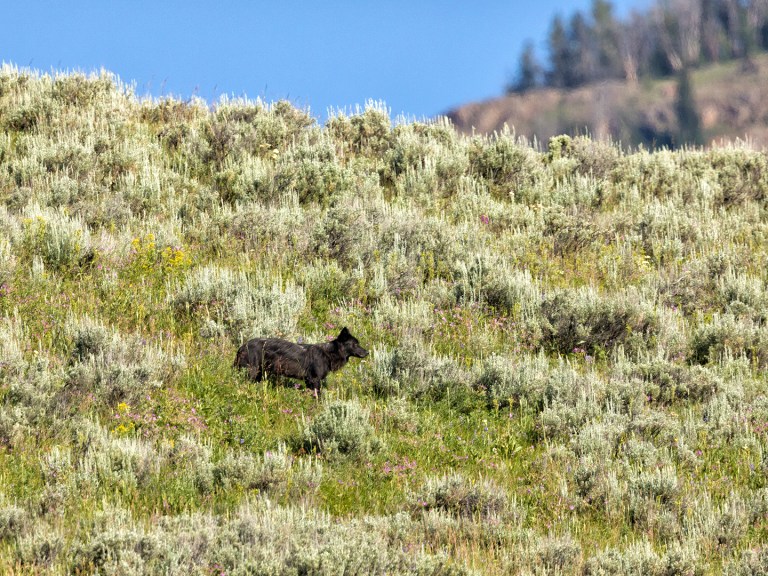 While driving through Lamar Valley one morning I noticed movement out of the corner of my eye:  a lone wolf moving towards the road!  It trotted across the road directly in front of my car, the closest I’d ever been to a wild wolf.  Everything happened so quickly I didn’t even have time to take out my camera.  A couple days earlier, though, I’d been able to catch a different wolf in the same area.