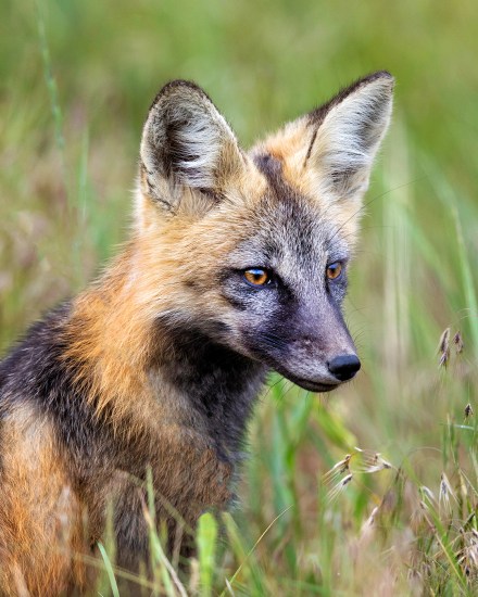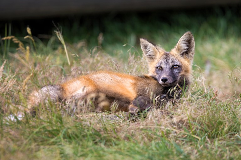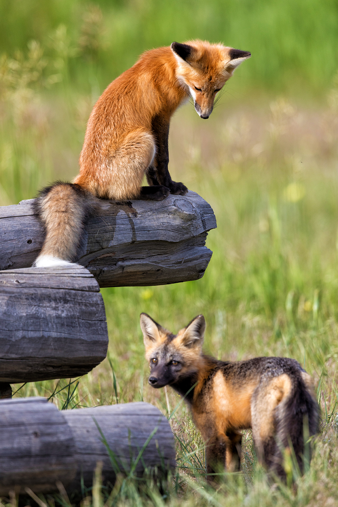 The logs, I was later told by locals who stopped to talk, had been there for many years, and this spring a fox mom converted them into a den.  The mom and three of her five pups had the less-common cross-fox coloration, with lots of black and gray fur instead of the usual orange-red.  The foxes were definitely aware when people were nearby but for the most part they seemed unconcerned as long as we stayed near the road.